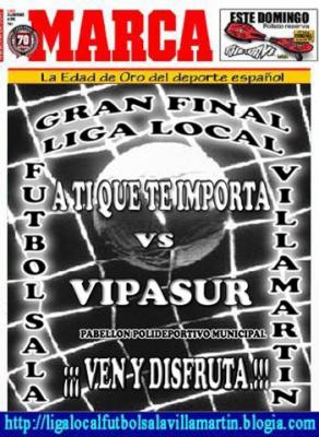 Dos de los equipos mas antigüos y que mas años llevan en la Liga Local de Villamartin van a ser quienes se disputen el campeonato de liga 2010/2011. Por un lado A Ti Que Te Importa que se impuso a Gacosur en el tercer y definitivo partido en la suerte de los penaltis. Por el otro Vipasur que se impuso con mas comodidad a Cafeteria David tambien en el tercer y definitivo partido. Así pues éste próximo sábado viviremos la gran final que coronará a A Ti Que Te Importa o Vipasur como campeón de la Liga Local de Fútbol Sala de Villamartin. Esperemos que ambos equipos nos brinden una gran final.